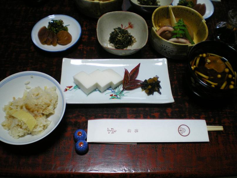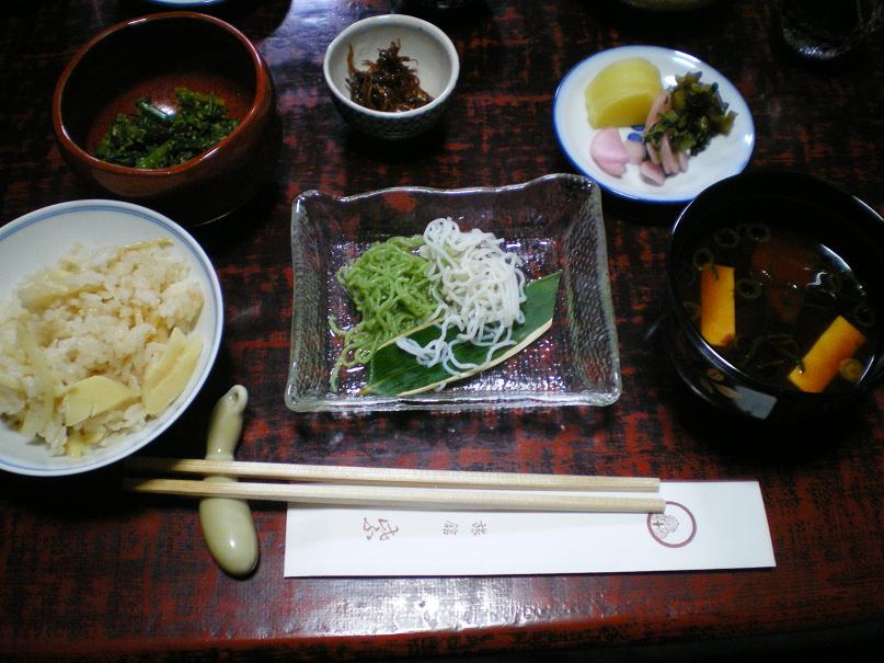 たけのこご飯、昆布添えのかまぼこ、イカとたけのこの煮物、ちりめん山椒と青菜のおひたし、漬物、おみそ汁。